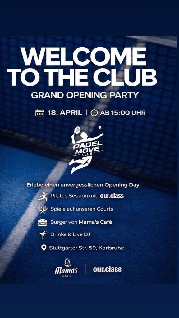 Eröffnung Padel-Anlage Eröffnung Padel-Plätze Liebe Mitglieder,am Samstag, den 18.04.2026 eröffnet unsere neue Padel-Anlage!Die Plätze können aktuell über unser Buchungssystem gebucht werden, Mitglieder der Tennisabteilung bekommen 15 € Rabatt.Folgt gerne dem Instagram-Account für weitere Infos: ➤ Padel Move Club